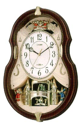美しい音色のオーロラサウンドのメロディ掛時計シチズンCITIZEN「パルミューズM463」電波時計4MN463023です毎正時になると、メロディと共に2体の人形が回転し、文字板左右のLEDが点滅し、クリスタルを照らします。