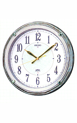 セイコー ライトが点灯する電波時計 ツイン・パ KS262Mというのはどうですか。関東局(40kHz)と九州局(60kHz)から発信される日本標準時刻電波のうち、より受信しやすい電波を自動的に受信し、自動で時刻を修正する電波機能を搭載した、プラスチック枠(薄緑メタリックマーブル模様塗装光沢仕上げ)の掛時計で、上品で高級感湛えるカラーリングや、精妙な模様がインテリアに映える、モダンで洗練された掛時計です。