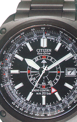 シチズン(CITIZEN)のプロマスター(PROMASTER)、PMD56-2973は、デュアルタイム表示可能な24時間針付のエコドライブ電波時計です。年間3000本限定です。迫力あるケースデザインは、ステルス機からイメージされています。パラボラアンテナをイメージする文字板外周部のパターン表現は、「電波」からのインスピレーション。